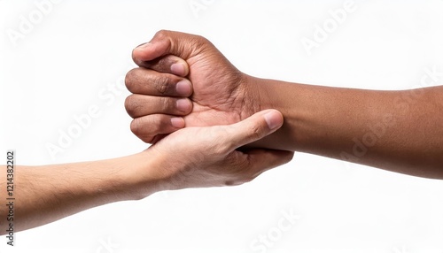 Close-up of diverse hands engaged in a friendly arm-wrestling match.