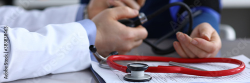 Close-up of doctor measuring pressure with tonometer to ill patient. Clipboard on table. Practitioner in medical gown and stethoscope. Health care and medicine concept
