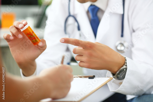 Close-up of doctor's hand holding medicine and giving it to his patient.