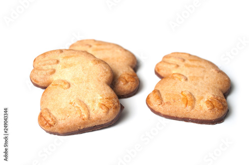 closeup of easter chocolate biscuits in shaped rabbits on white background