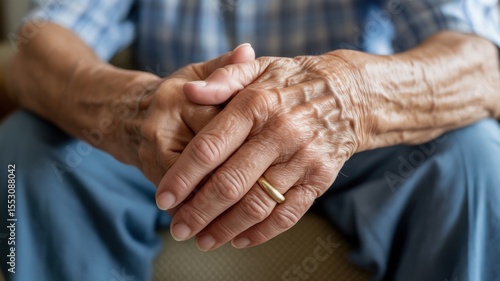 Close-up of elderly caucasian male hands with wedding ring displaying age and experience