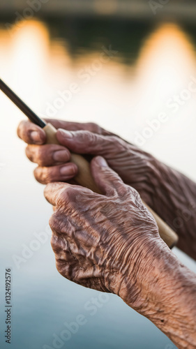Close-up of elderly hands holding a fishing rod handle, showing textured skin and visible veins, symbolizing age, experience, and the passage of time