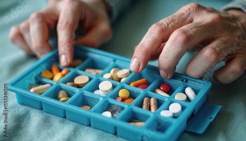 Close-up of elderly hands sorting medication in pill organizer. Daily healthcare routine for seniors. Medication management, pillbox, health, healthcare, medicine, vitamins.