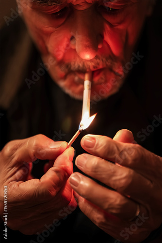 Close-up of elderly man lighting a cigarette with a match. Dark background. Concept of aging and addiction