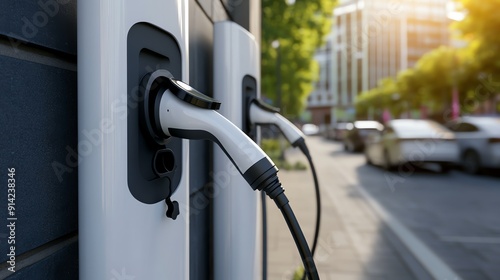 Close-up of electric vehicle charging station with plugged charger in a modern urban setting. Green energy and eco-friendly concept.