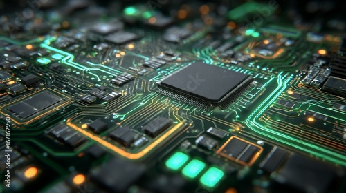 Close-up of Electronic Circuit Board with Microchip and Glowing Green and Orange Lights