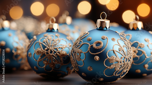 Close-Up of Elegant Blue and Gold Christmas Ornaments