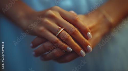 Close-up of elegant hands showcasing a delicate gold engagement ring with a sparkling diamond, the soft lighting and focus on the ring create a romantic and timeless moment