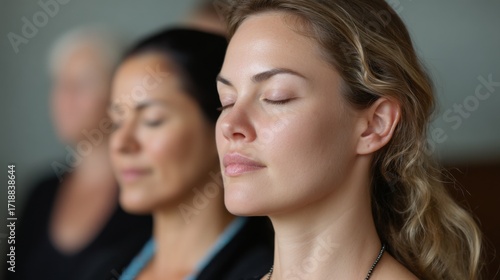 Close-up of European women practicing mindfulness and meditation in a serene retreat setting.