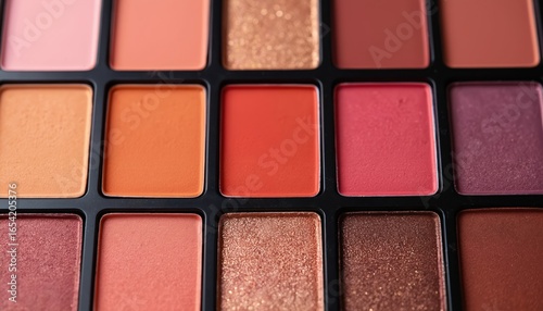 Close-up of eyeshadow palette featuring vibrant color spectrum. Includes matte, shimmering shades of pink, orange, coral, brown. Ideal for creative makeup application, beauty trends, artistic