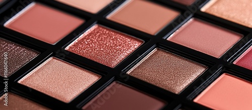 Close-up of eyeshadow palette with various shades of pink, brown, and peach.