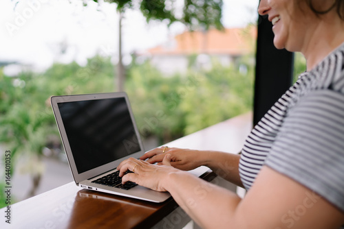 Close-up of female freelancer typing on laptop near balcony, smiling while working remotely in tropical environment, enjoying digital flexibility and comfort.
