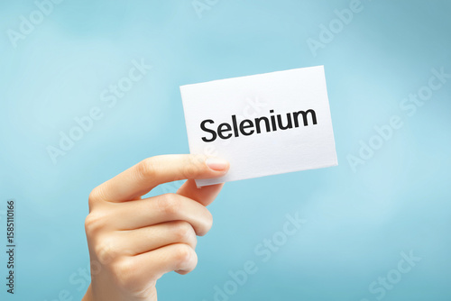 Close-up of female hand holding white sign with text 'Selenium' on light blue.