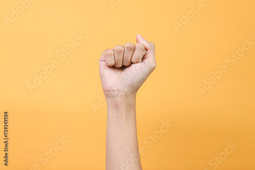 Closeup of Female Hand Raised up Clenched fist Isolated over Yellow Background