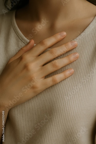 Close-up of female hand with natural nails on beige ribbed top
