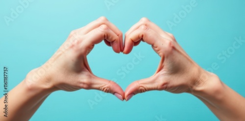 Close-up of female hands forming a heart symbol on light blue background, love, blue