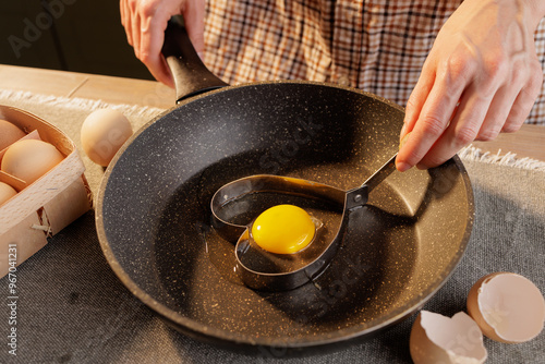 close-up of female hands holding a heart shape on a frying pan with a broken egg, heart-shaped fried egg