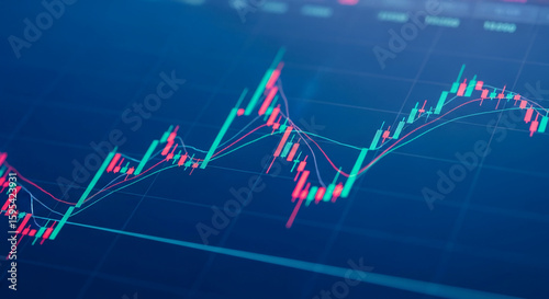 Close-up of financial chart displaying teal and red candlestick patterns on a dark blue grid, illustrating market trends and data analysis for investment decisions