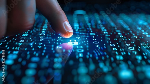 Close-Up of Fingerprint Touching Digital Interface with Glowing Data Points and Network Connections -Generative AI