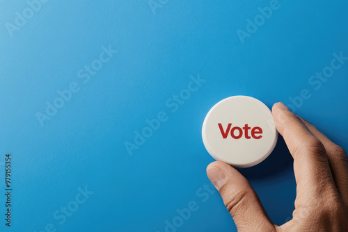 Close-up of fingers pressing a Vote button on a touchscreen, showcasing the technology used in contemporary elections for accessible and efficient voting.