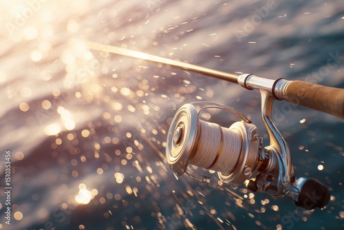 Close-Up of Fishing Rod with Reel Near Sparkling Water Surface on Bright Sunny Day, Capturing the Essence of Outdoor Leisure and Adventure in Nature