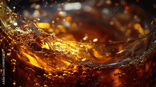 Close-up of fizzy beverage splashing in a glass with vibrant bubbles and reflections