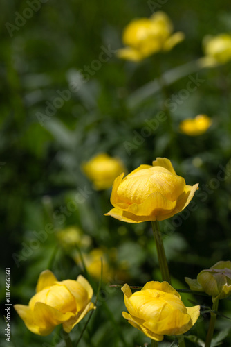 Closeup of flowers of Common globeflower (Trollius europaeus) in a meadow in summer in Italy