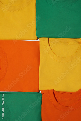 Closeup of folded colorful yellow, orange and green cotton t shirts. Flat lay tees template