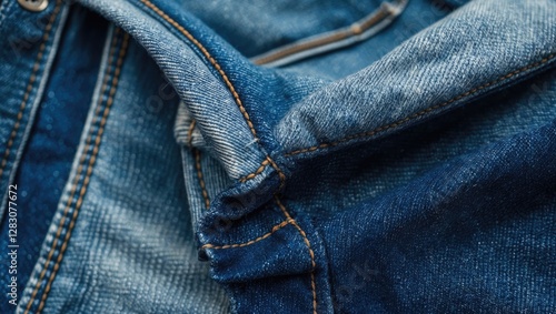 Close-up of folded denim fabric showcasing texture and stitches in various shades of blue and indigo tones