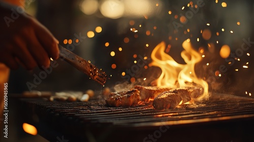 Close-up of food grilling over an open flame, sparks flying in the night