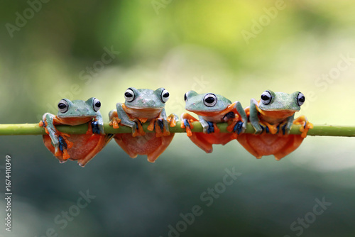 Close-up of four Javan tree frogs sitting side by side on a branch, Indonesia