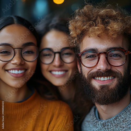 Close-up of four professional colleagues smiling and expressing positive emotions in a teamwork environment, symbolizing collaboration and success.