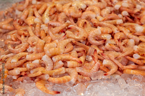 Closeup of fresh caught pink baby shrimp at a local fish and seafood market.