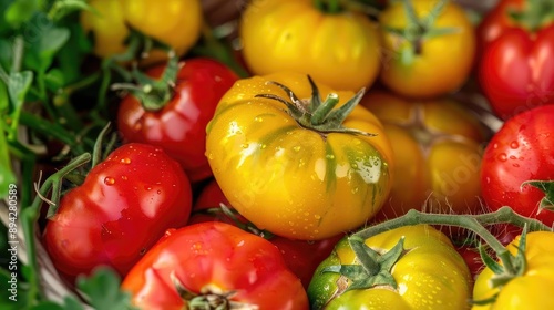Close-up of fresh, colorful heirloom tomatoes, highlighting their vibrant yellow and red hues, perfect for food photography or culinary projects.