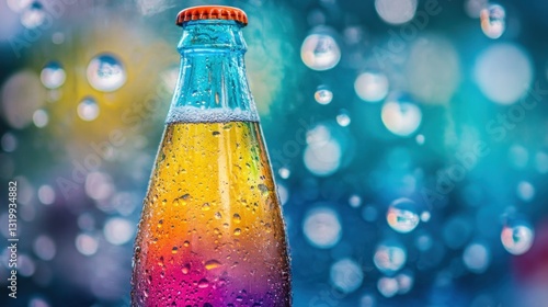 Close-Up of Fresh Drink Bottle with Colorful Background and Water Drops, Evoking a Fresh Feeling
