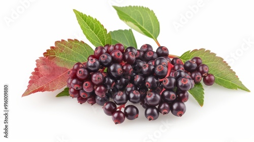 Close-up of fresh elderberries, halved to reveal the juicy interior. Isolated on white, showcasing the intricate details and natural beauty