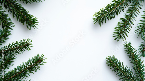 Close-up of fresh fir tree branches arranged around a blank space, perfect for holiday-themed backgrounds and seasonal designs.