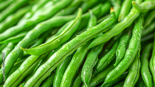 Close-up of fresh green beans with water droplets, highlighting their crisp texture and healthy appeal.