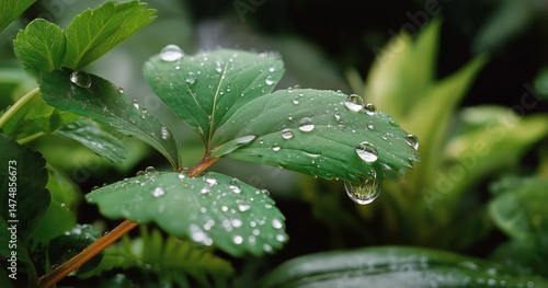 Close-up of Fresh Green Leaves With Water Droplets in a Lush Garden After a Rain Shower
