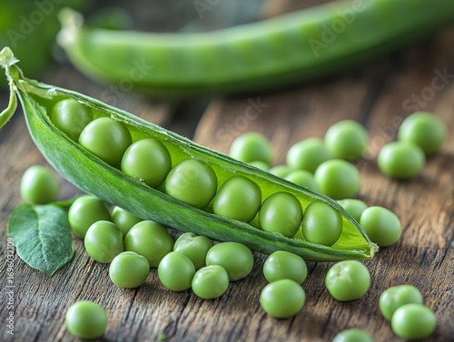 Close-up of fresh green peas spilling from an open pod onto a wooden surface