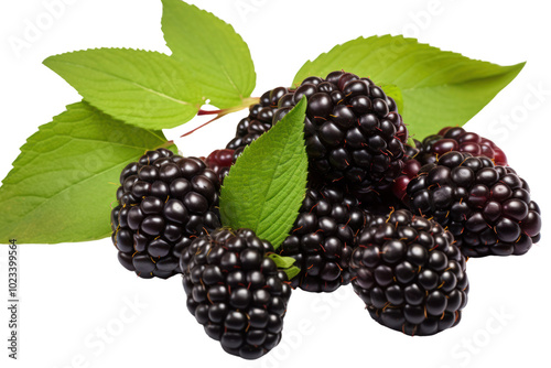 Close-up of fresh, juicy blackberries with a few leaves for garnish on a clean white background