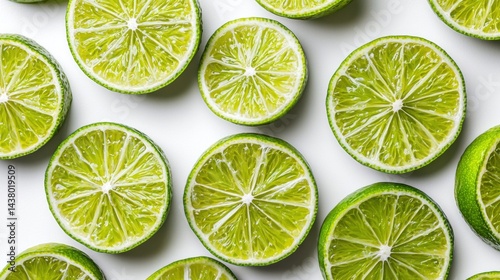 Close-up of fresh juicy lime slices arranged on a white background for culinary, beverage, or decoration purposes with vibrant green color and detailed texture