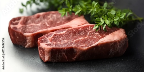 Close-Up of Fresh, Marbled Red Beef Ribeye Steak Ready for Culinary Preparation and Cooking