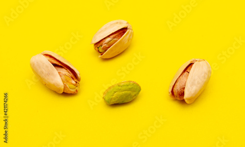 Close-up of fresh pistachio nuts on a yellow background.
