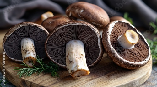 Close-up of Fresh Portobello Mushrooms on Rustic Cutting Board for Culinary Inspiration in Organic Cooking Healthy Eating and Gourmet Recipes