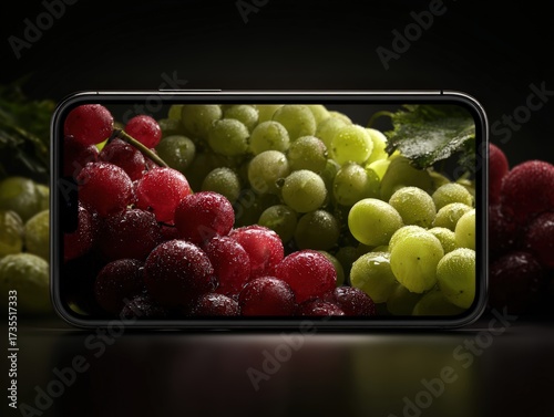 Close-up of fresh red and green grapes displayed on a sleek smartphone screen with detailed textures and vibrant colors