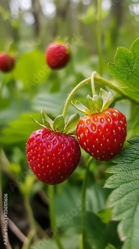 Closeup of Fresh Red Strawberries on Vine in Lush Green Garden : Generative AI