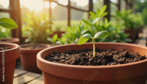 Close-up of fresh soil inside a ceramic pot, indoor greenhouse with a small sprout emerging, Earth Day