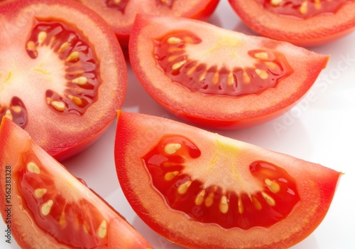 Closeup of fresh tomato slices isolated on white background, showcasing their juicy texture and vibrant color