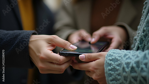 Close-Up of Friends Interacting with Smartphone: Social Connectivity and Technology Use in Stock Photo